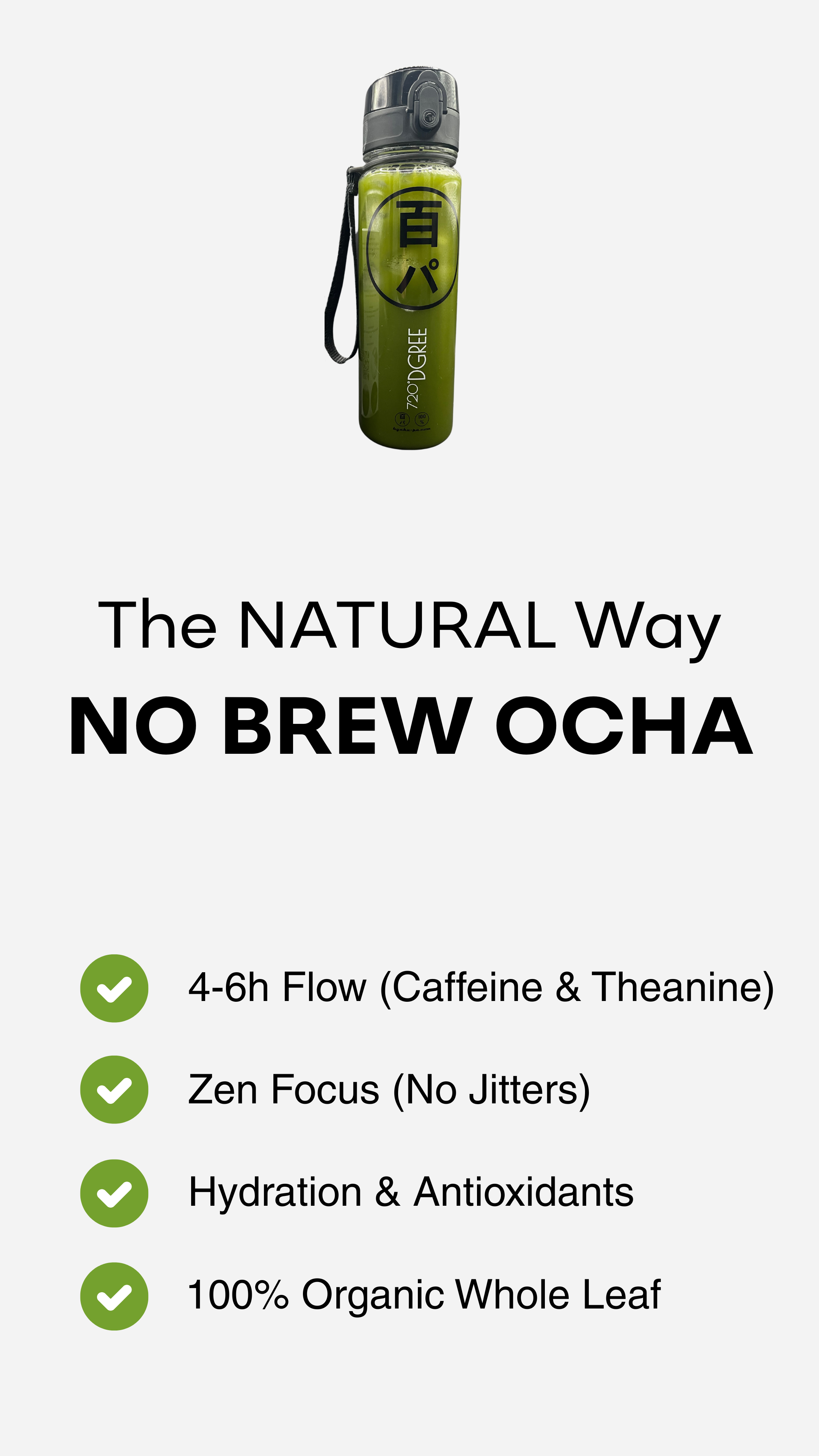 Using the entire leaf HYAKU-PA NO BREW OCHA provides the maximum health and functional benefits of all the components of Japanese green tea, while seamlessly integrating into daily routines such as work, study, sports, and travel.