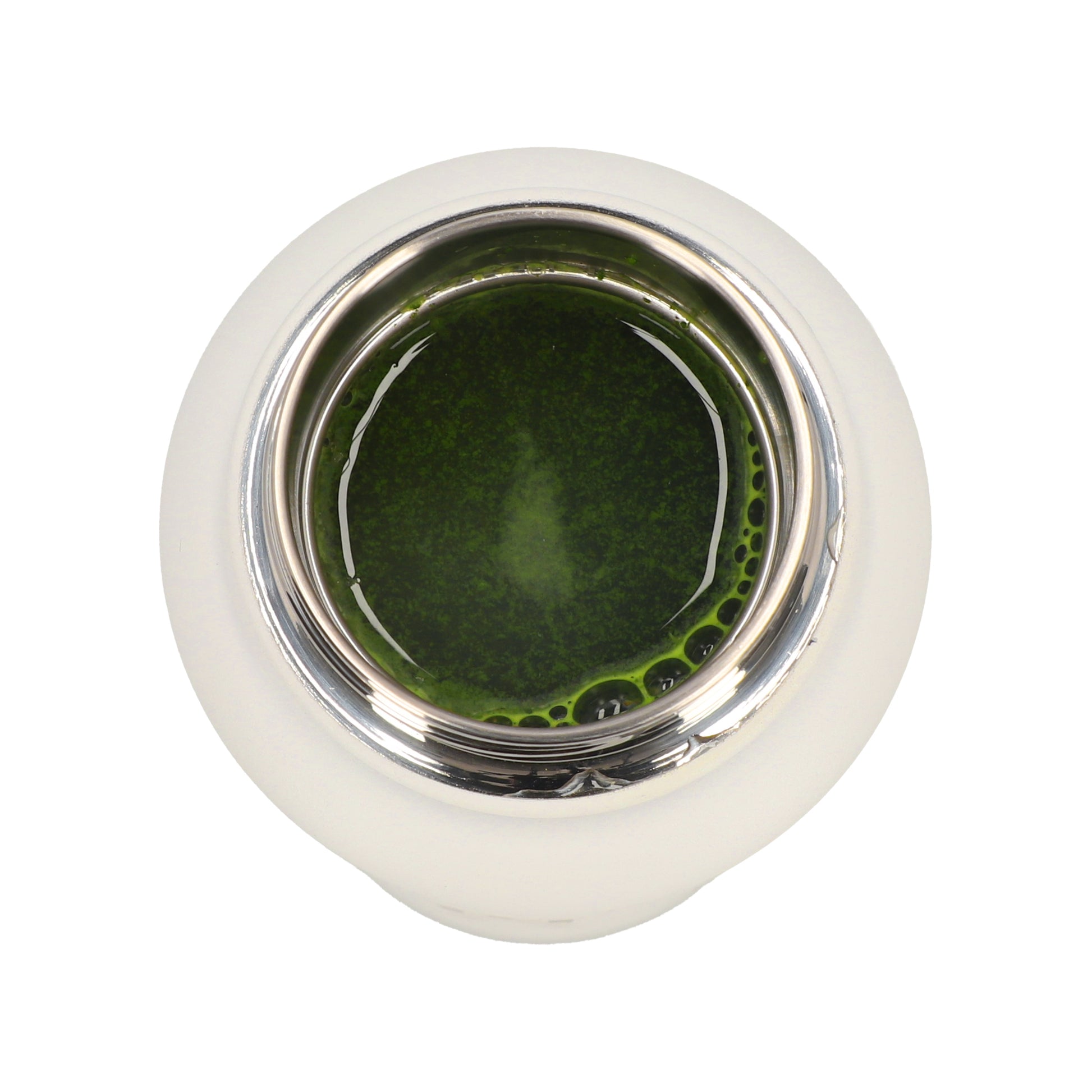 The mix of 80% matcha from a field in Shizuoka's Abe valley (Okumidori/Yabukita/Saemidory, 1st picking, 24 days shaded, stone mill and ball mill) and 20% 3mm leaf particles of Asatsuyu sencha from a field in Kagoshima's Kirishima mountains delivers bold flavors - umami, sharpness, and floral freshness - for a rich and clean, nuanced taste and a unique sensory experience.